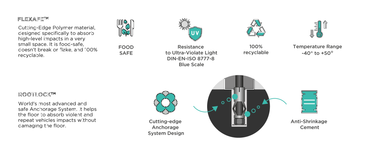 It stops the crashing vehicle safely without breaking itself and without breaking the floor.